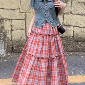 set girls vintage denim tartan fusion