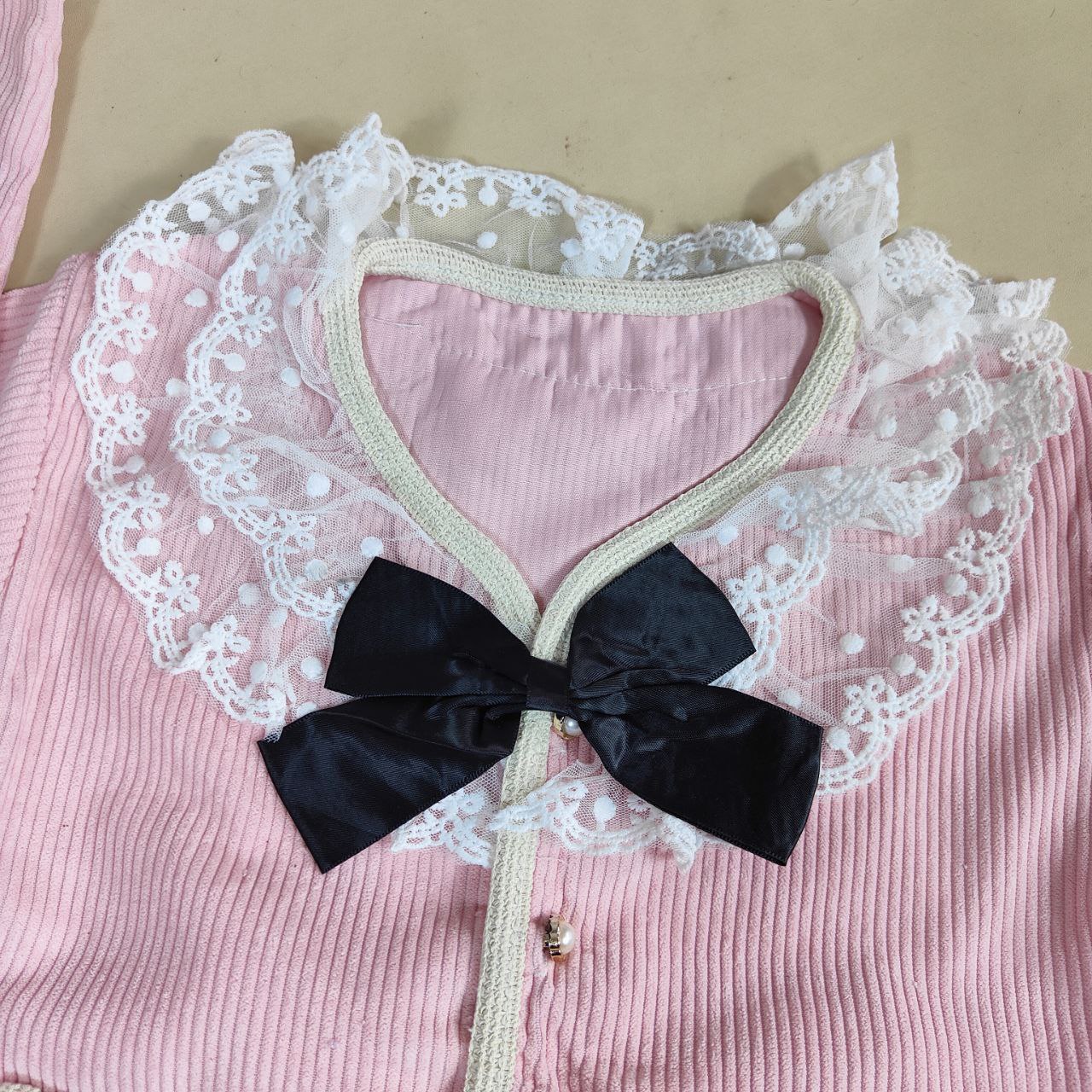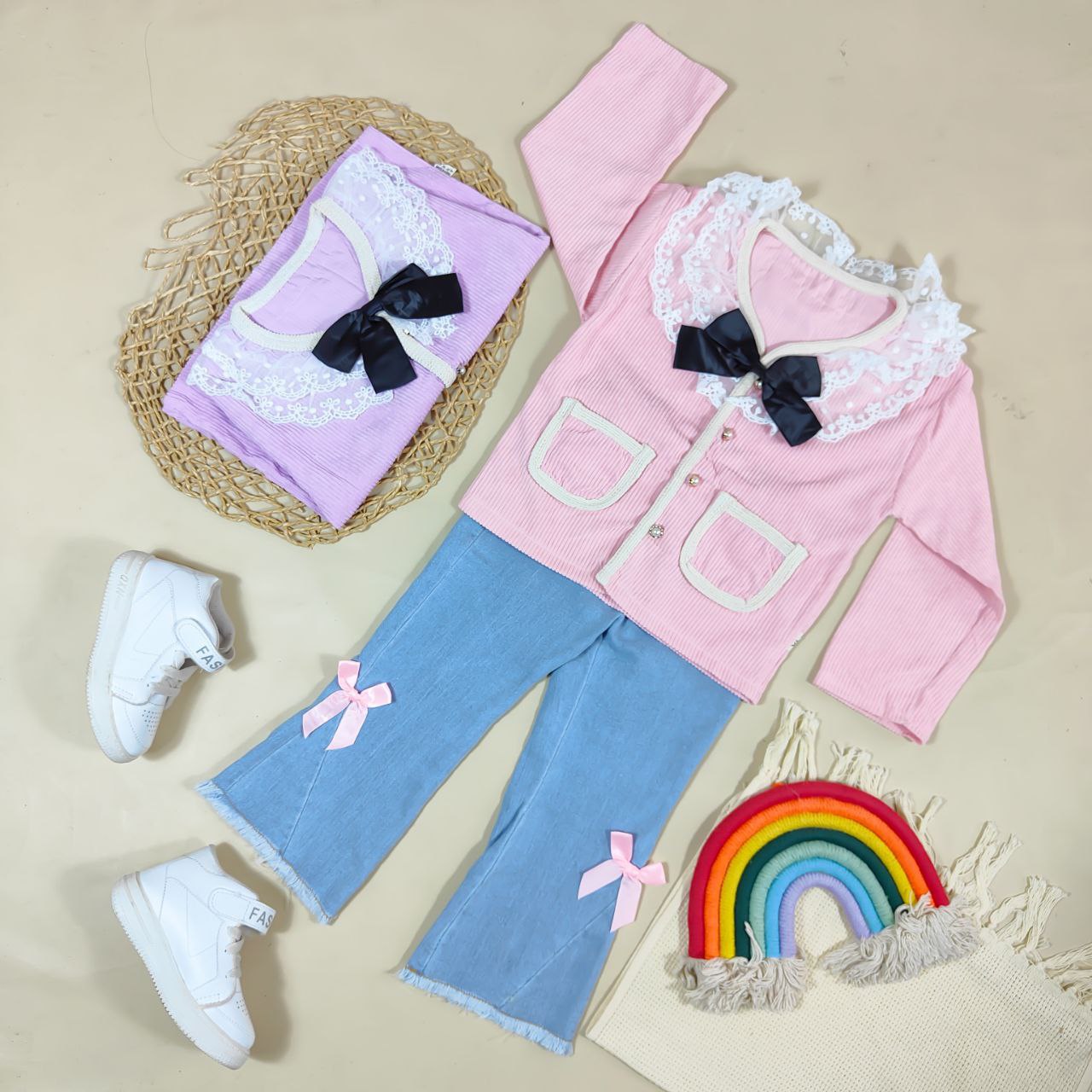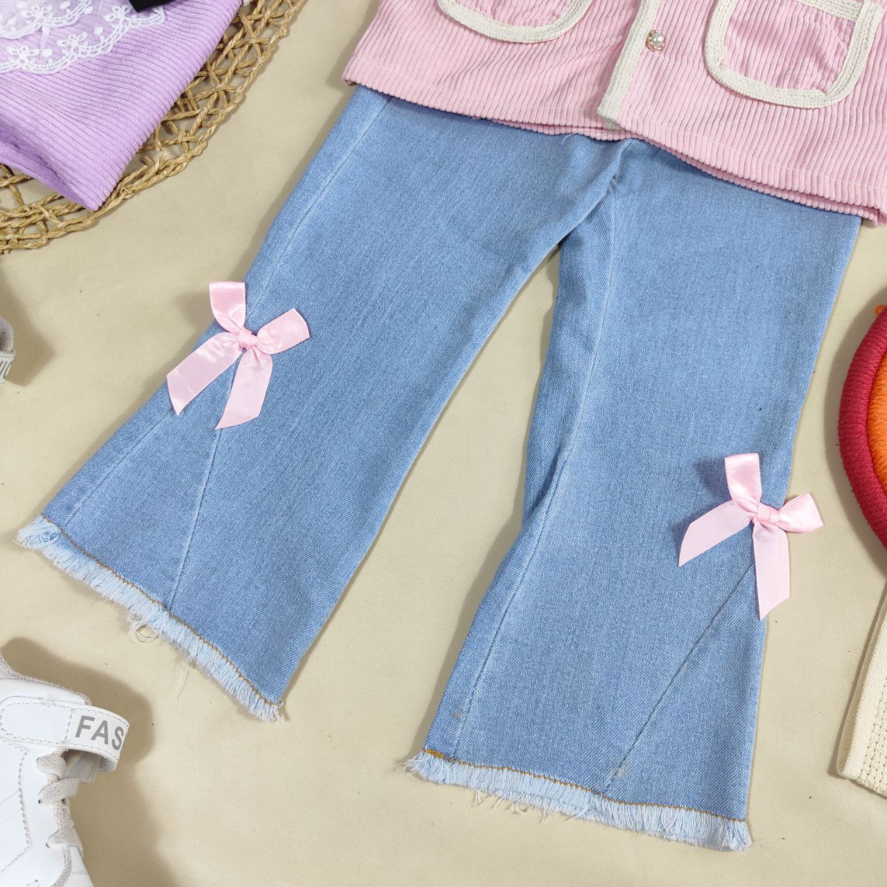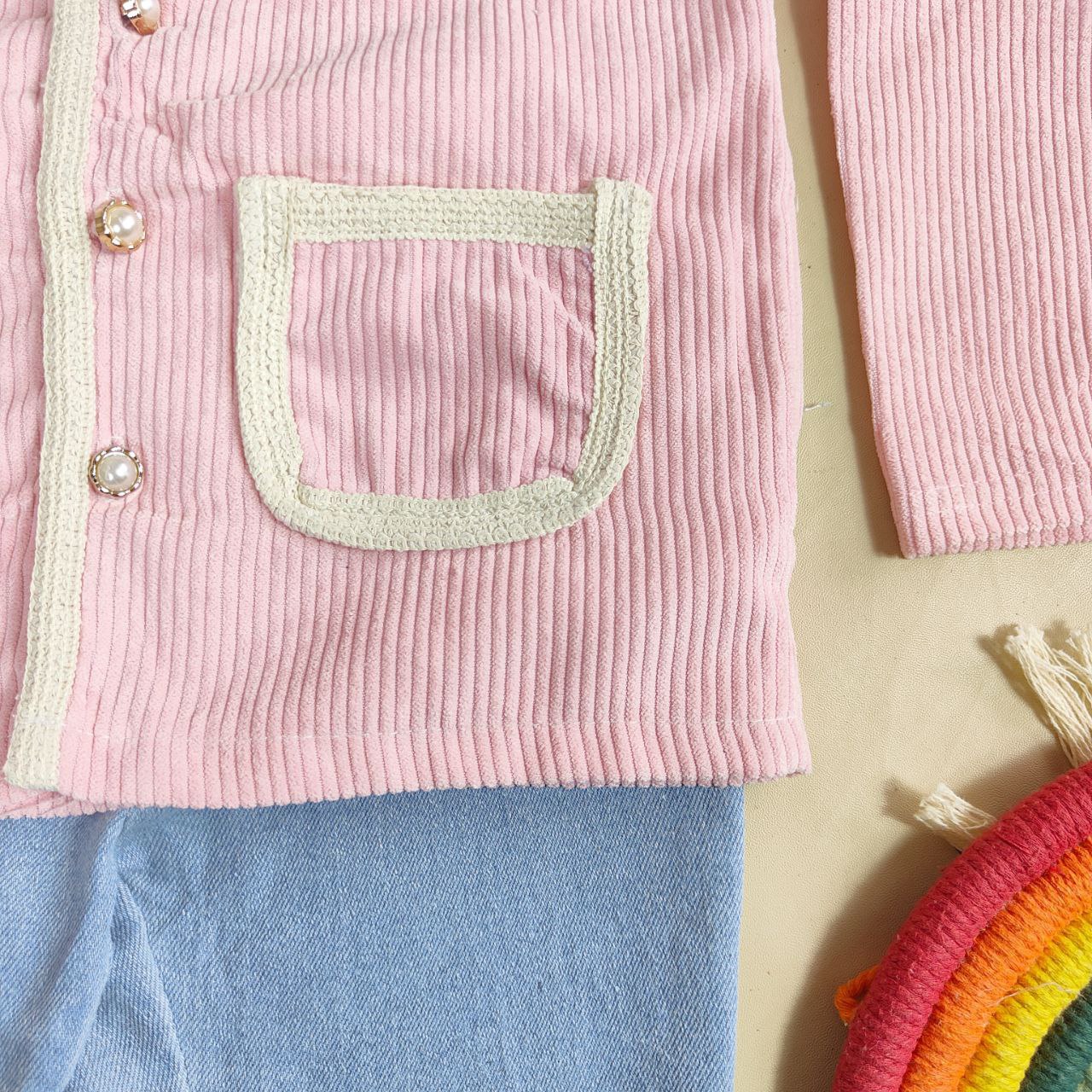 Setelan Pretty Middle Ribbon adalah pilihan manis dan nyaman untuk anak usia 1-4 tahun. Atasan berbahan corduroy yang lembut dipadukan dengan celana denim yang stylish, tersedia dalam warna pink dan ungu. Cocok untuk berbagai kesempatan dari bermain hingga acara santai. Dapatkan harga lebih hemat dengan pembelian lebih dari 6 setel!